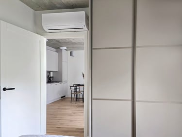 Apartamentuose yra atskiras miegamasis su patogia dvigule lova, svetainės zona su ištiesiama sofa, modernus vonios kambarys su dušu bei kondicionierius, užtikrinantis komfortą bet kuriuo metų laiku. Pilnai įrengta virtuvė su visa buitine technika leis pasijausti kaip namie net ir toliau nuo namų. Čia rasite ne tik funkcionalumą, bet ir subtilų dizaino jausmą – viskas tam, kad Jūsų poilsis būtų tikras malonumas.