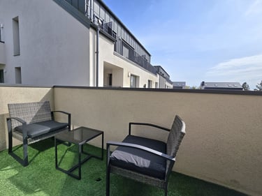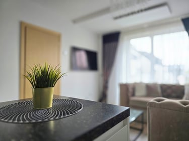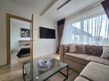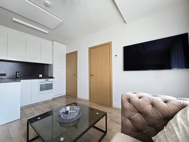 Erdvus miegamasis su didele dvigule lova užtikrina ramų ir kokybišką poilsį, o šviesi svetainės erdvė su patogia, išskleidžiama sofa-lova puikiai tinka papildomiems svečiams ar šeimai. Pilnai įrengta virtuvė su valgomojo zona leidžia mėgautis patogumu kaip namuose. Apartamentai turi privatų balkoną – idealią vietą rytinei kavai ar vakariniam poilsiui.