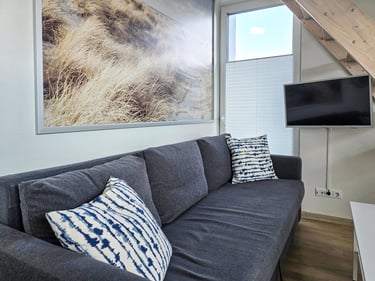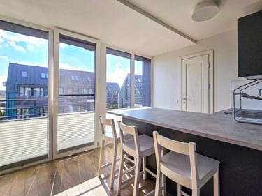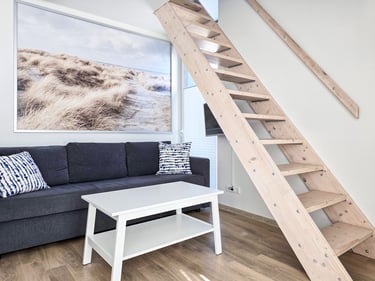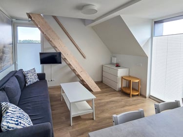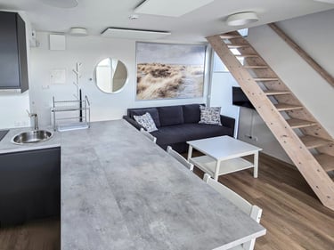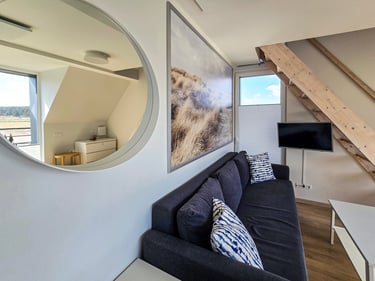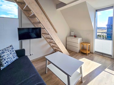 Apartamentai pritaikyti patogiam apsistojimui iki 4 asmenų. Čia rasite vieną miegamąjį su patogia dvigule lova bei erdvų svetainės kampą su miegama sofa. Natūrali šviesa, skandinaviškas interjeras ir šlaitinės lubos kuria šiltą ir jaukią atmosferą. Jūsų patogumui – plokščiaekranis televizorius, nemokamas Wi-Fi, visi reikalingi baldai ir buitinė technika. Pilnai įrengta virtuvė leis pasigaminti mėgstamus patiekalus tiesiog namuose, o privatus balkonas su lauko baldais taps mėgstama vieta rytinei kavai ar vakaro taurei vyno.